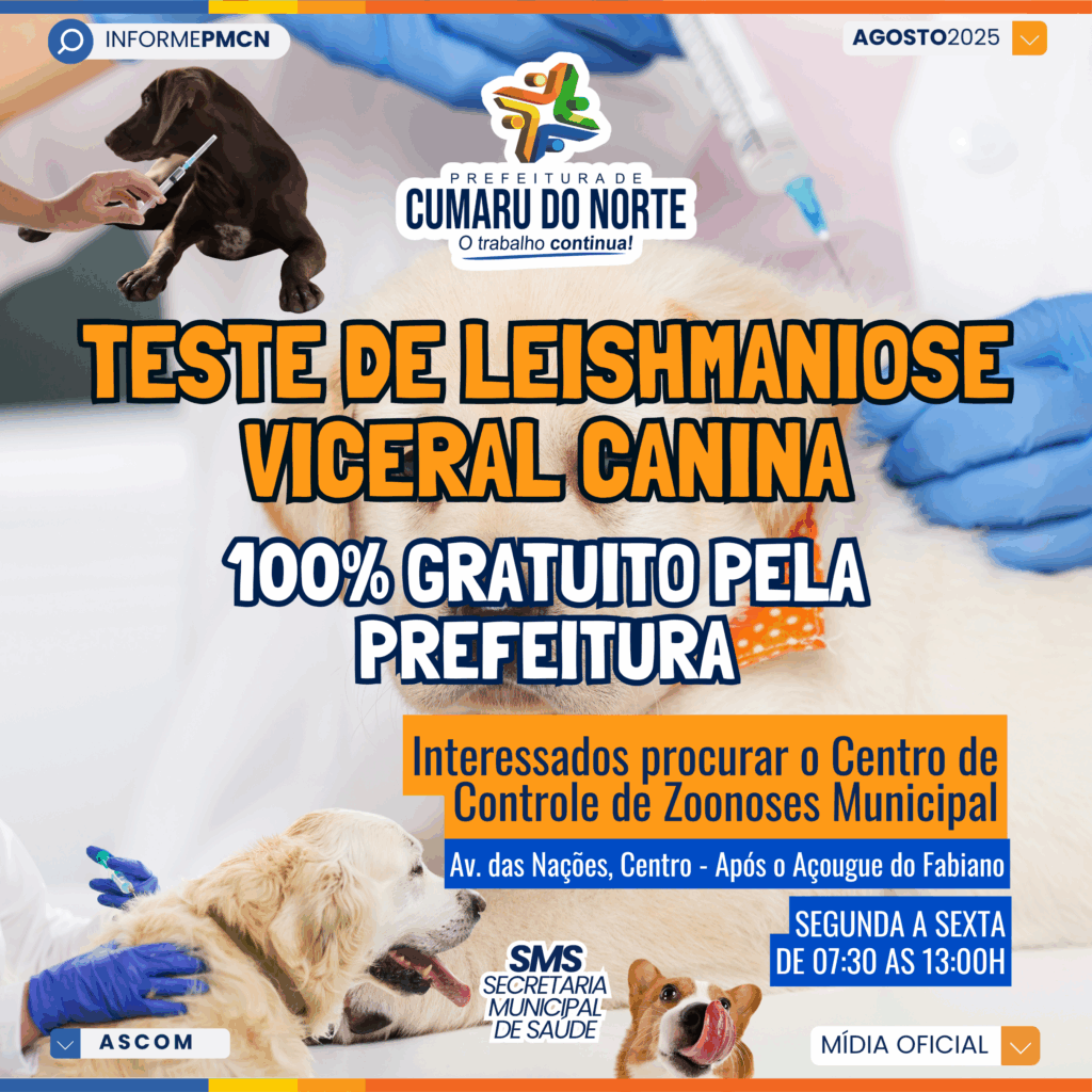 A Prefeitura de Cumaru do Norte, por meio da Secretaria Municipal de Saúde, informa que está realizando o teste de Leishmaniose Visceral Canina (Calazar). Os testes são totalmente gratuitos e destinados aos cães da nossa cidade.
